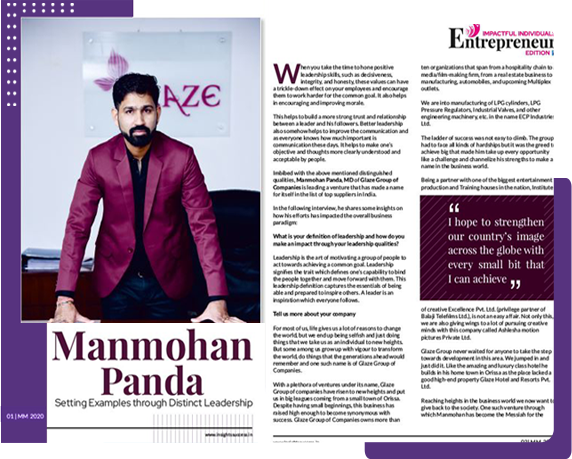 Mr. Manmohan Panda who is heading the Glaze Group as Chairman and Managing Director and Director of ECP Industrial Limited and EMRP Automobiles Pvt. Ltd. and business partner of ICE. Leadership is an art.